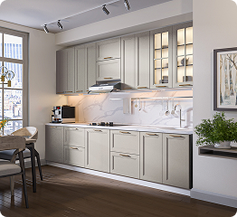 В расчет стоимости кухонного гарнитура входят: напольные шкафы и навесные полки с фасадами, фурнитура, ножки, петли, направляющие.