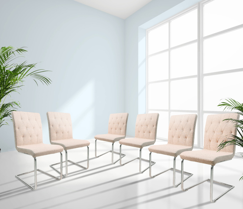 Сиденье - ткань, фанера. Ноги - металлическая трубка с хромированной отделкой. Размер изделия: 46 (Ш) x93 (в)x55. 5 (г)см. Сиденье Высота: 47см. Комплект, 6 стульев.
