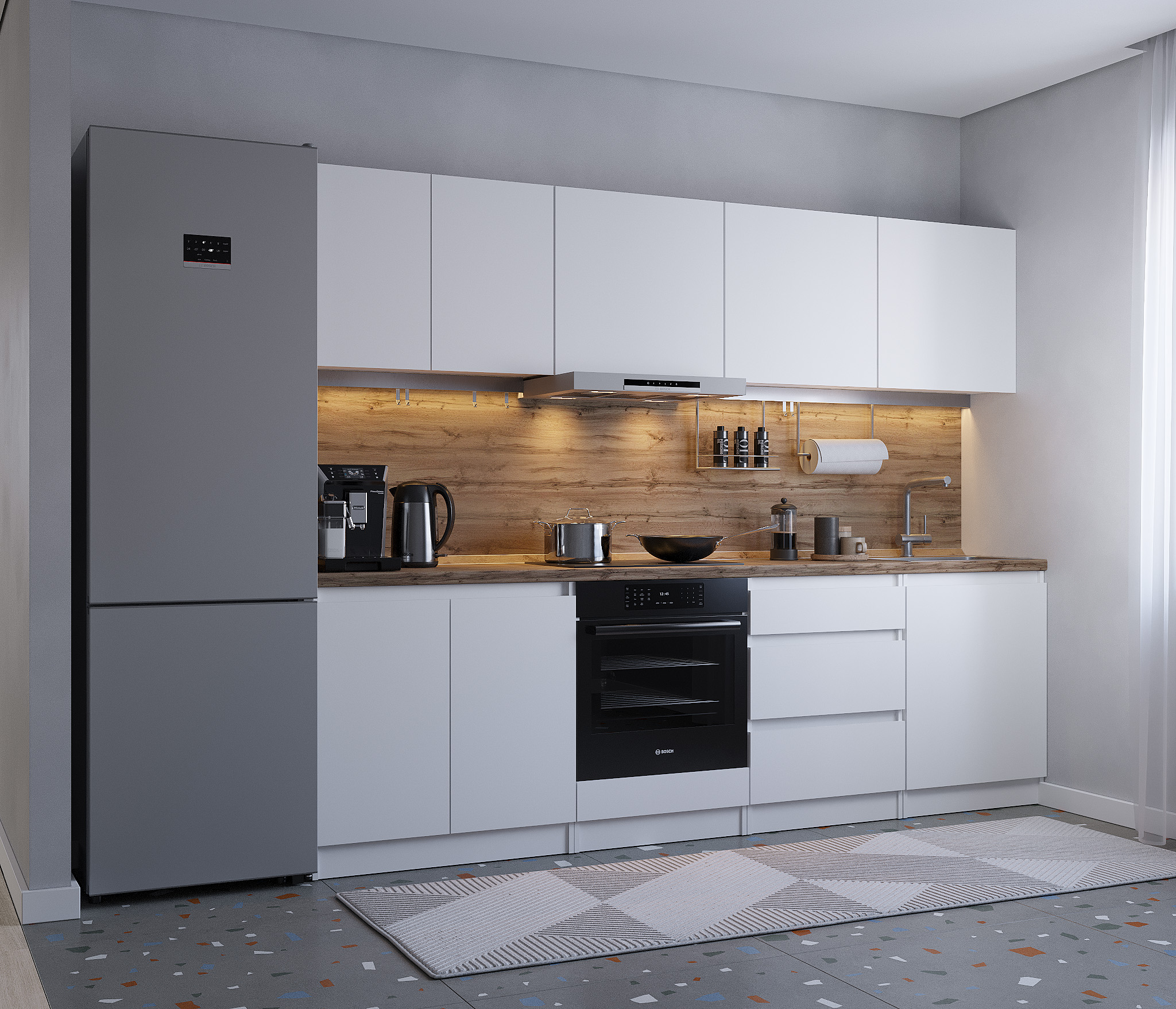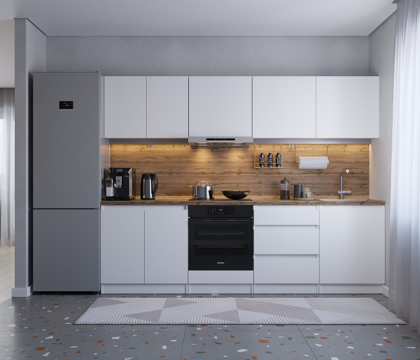 Кухня Леон сочетает в себе функциональность, стиль и доступность, и является прекрасным выбором для тех, кто ищет компактное и удобное решение для своей кухни. Кухонный гарнитур Леон идеально подходит для помещений с ограниченным пространством. Корпус и фасады выполнены из белого ЛДСП. Фасады столов и шкафов не имеют лицевой фурнитуры и открываются захватом за тыльный край фасада. Леон смотрится современно, а отсутствие ручек упрощает уход за поверхностью.