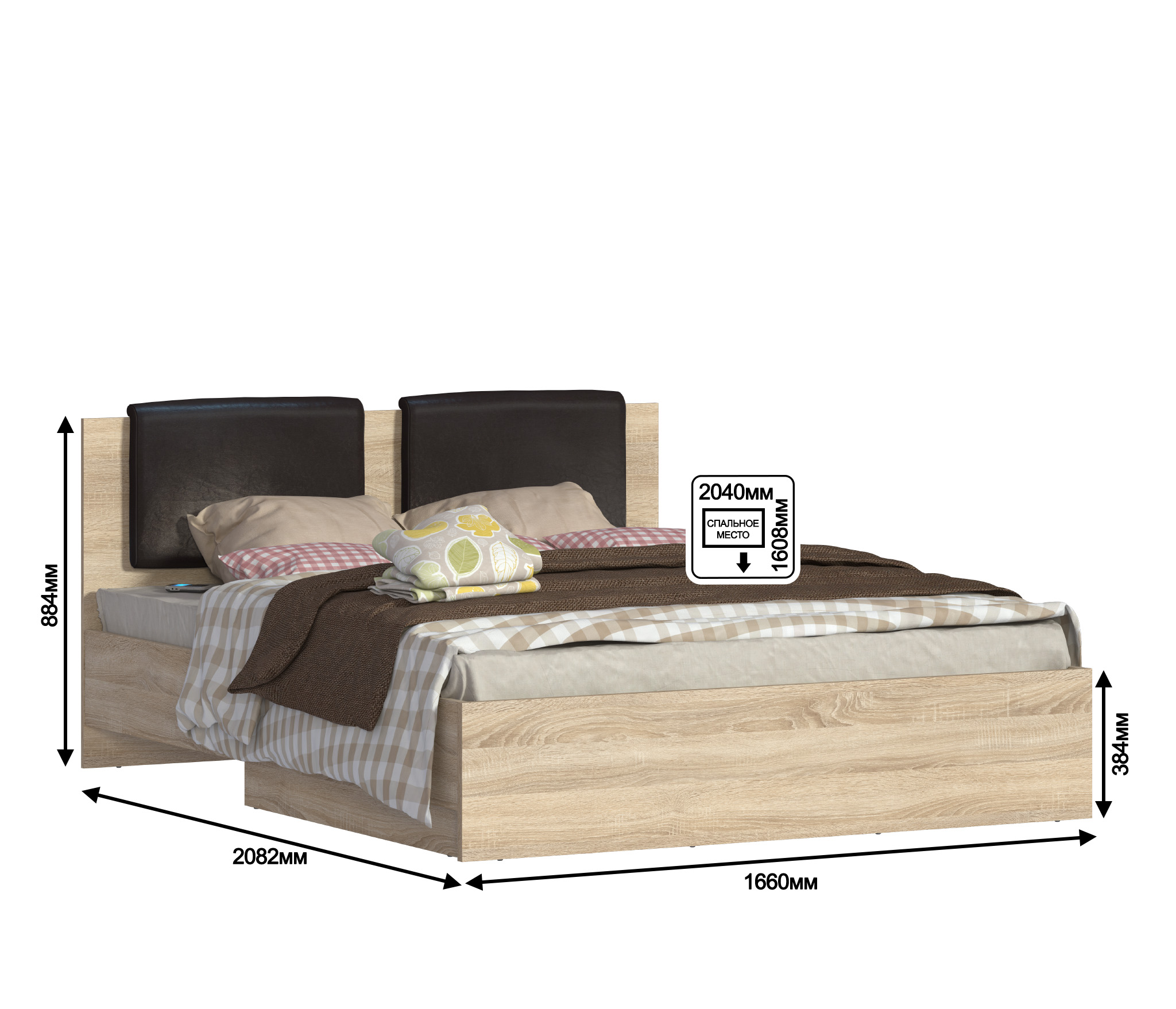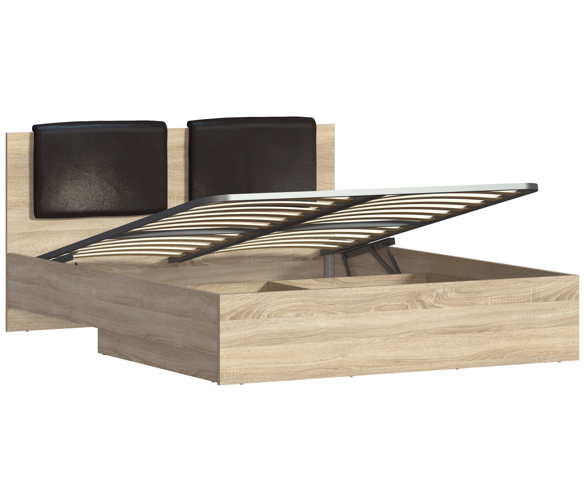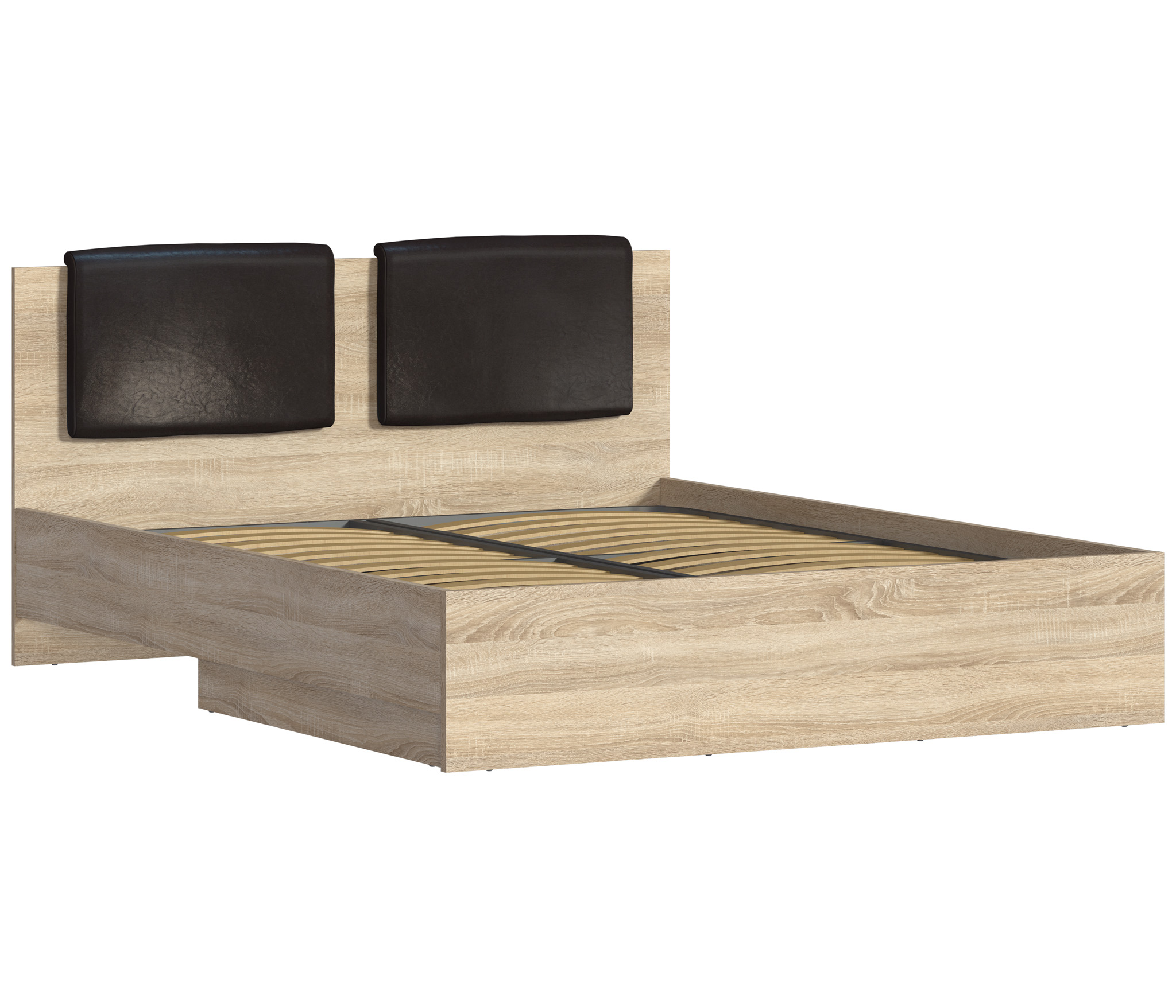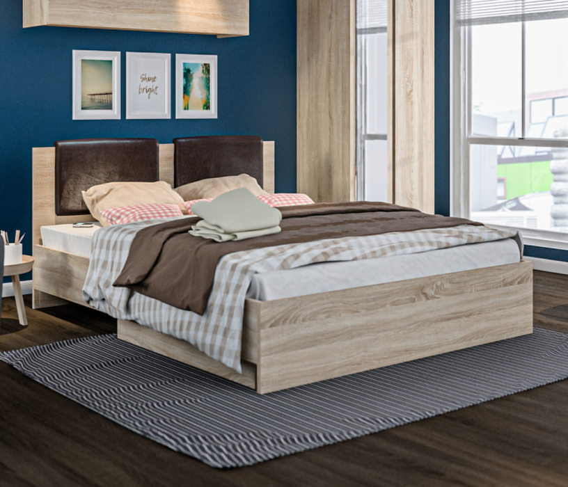 Отличная кровать. В комплекте поставляется мягкое изголовье в виде накладки. По желанию можно и не устанавливать. Искали для себя вариант с подъемным механизмом. От идеи приобретения кровати с выдвижными ящиками сразу отказались, в виду того что со временем на полу остаются следы от колесиков. Материал кровати качественный. Дуб сонома светлый с текстурным видом натурального дерева придает мебели солидный вид.