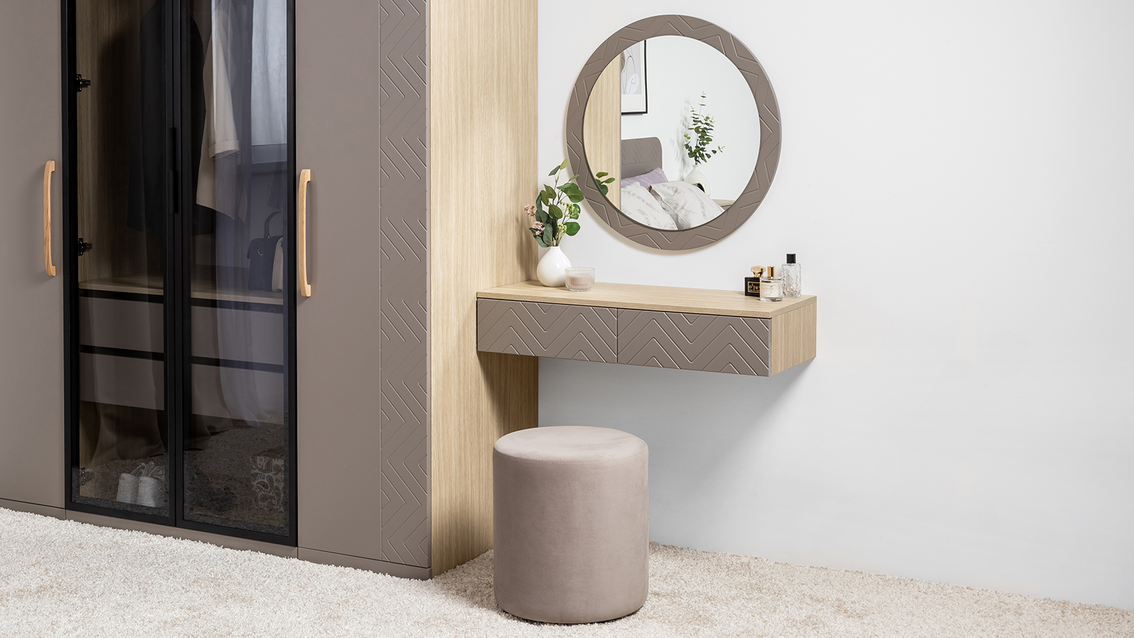 Подвесные консоли и велюровый пуф в тон фасадов дополняют сдержанный и благородный облик спальни Амьен.