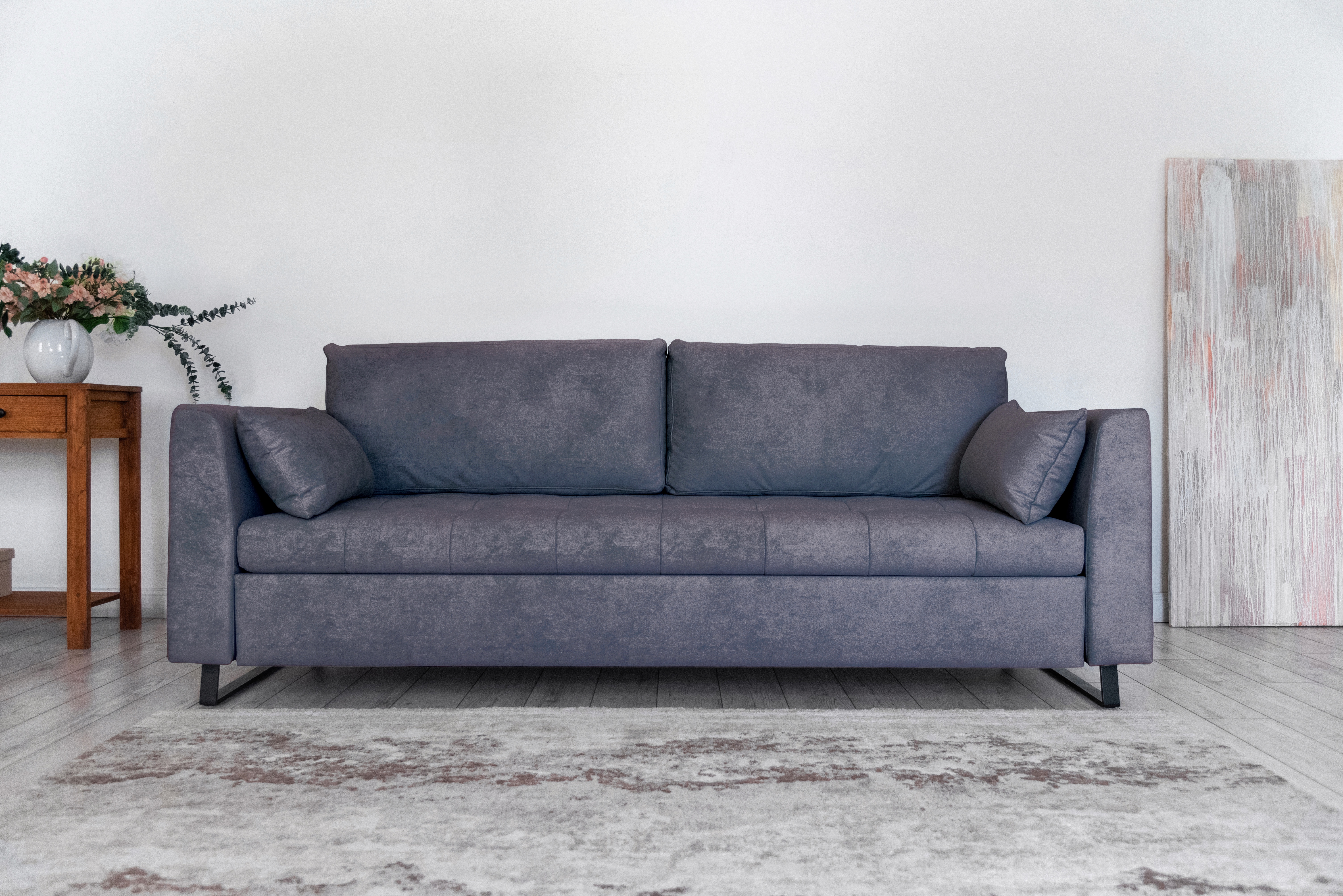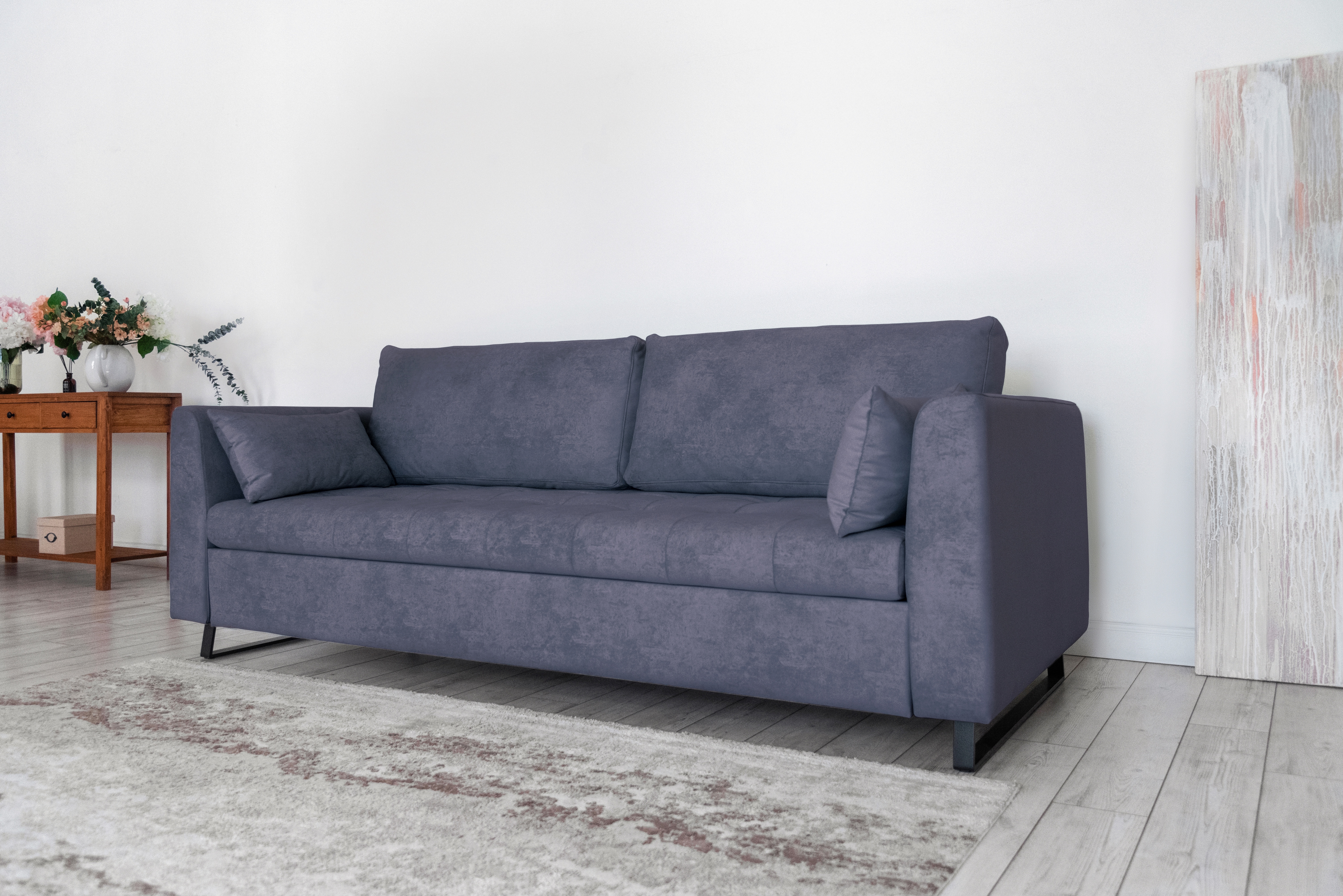Механизм трансформации — шагающий (пантограф). Что позволяет использовать этот диван вместе с высокими коврами, и значительно упрощает раскладывание.