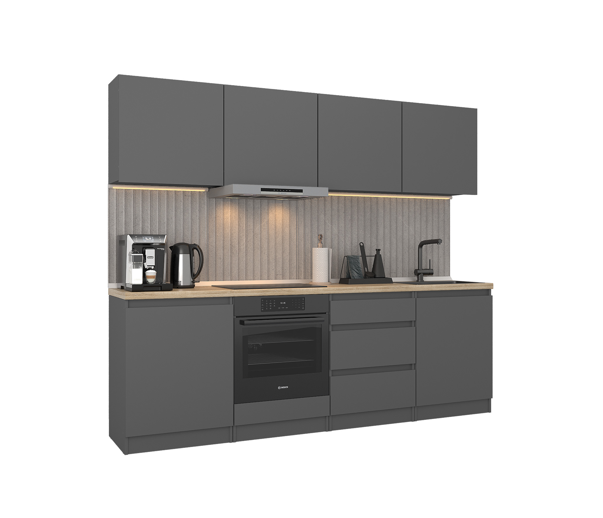 Обратите внимание, что столешница, стеновая панель, мойка и смеситель не входят в комплектацию кухни Леон и приобретаются отдельно. Это позволяет вам выбрать идеальные аксессуары и элементы для создания индивидуального дизайна вашей кухни.
