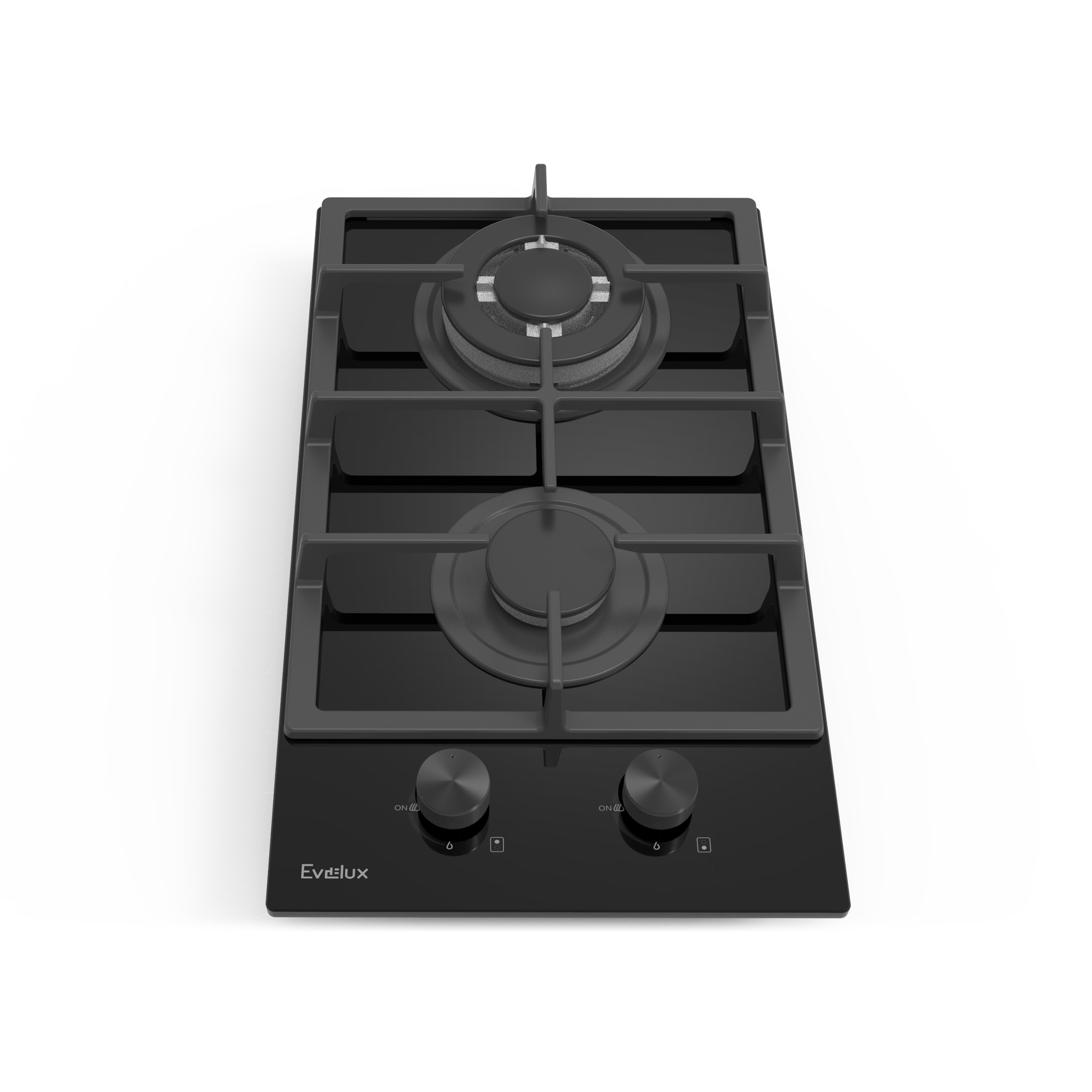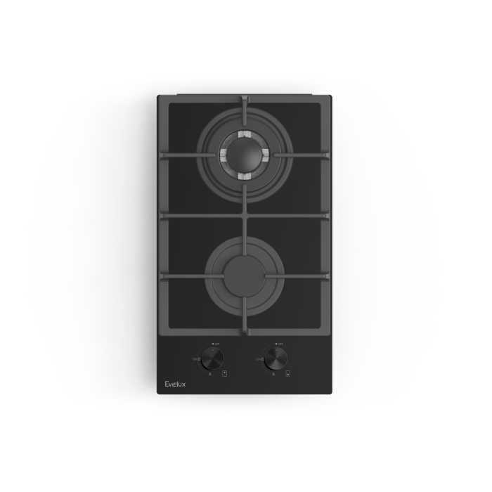 Варочная панель газовая, 30 см, 2 конфорки: экономичная конфорка (1 кВт), Вок конфорка (3,3 кВт), газ-контроль, электроподжиг, черное высокопрочное закаленное стекло, чугунные решетки, поворотные переключатели, комплект форсунок-переходников на балонный газ, 305х520х110 мм.