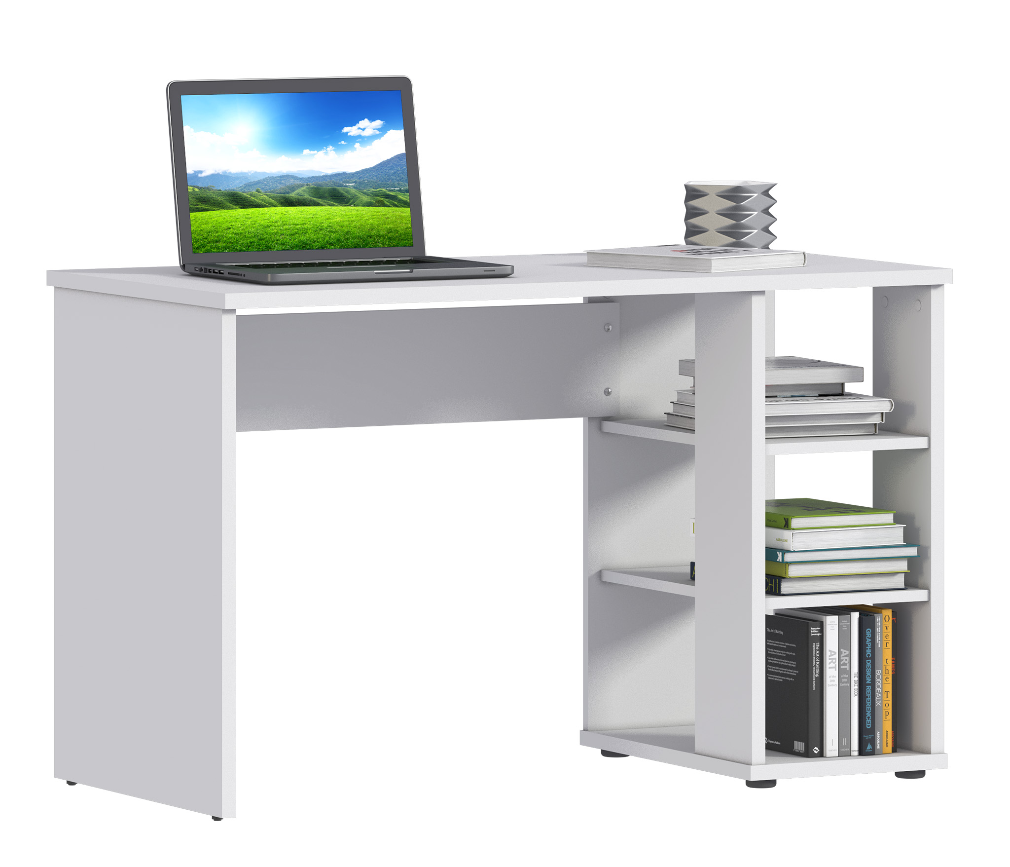 Стол Медея СБ-2877 – компактное и комфортное рабочее место. Такой стол не займет много места в комнате студента или школьника, а также будет органично смотреться в кабинете или офисе. Габаритные размеры стола Медея – ширина 119 см, высота 75 см и глубина 59 см. Под рабочей поверхностью расположена одна открытая тумба с тремя вместительными полками. Произведен стол из экологичного современного КДСП. Цвет отделки – белый.
