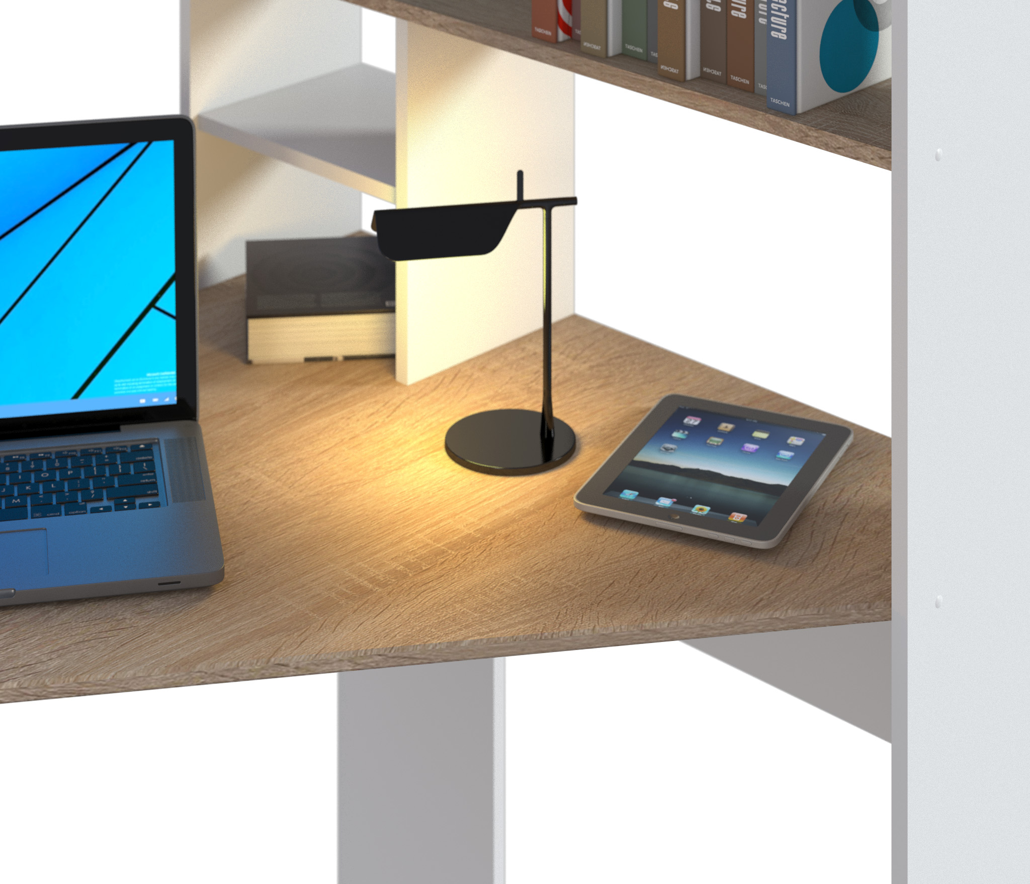 Стол Мамбо СБ-2986 – комфортное рабочее место. Благодаря продуманной конструкции и легкому минималистичному дизайну, стол не создает ощущение громоздкости в помещении. Габаритные размеры стола Мамбо – ширина 101 см, высота 138 см и глубина 93 см. Привычных для письменных столов тумб здесь нет, но есть вместительное отделение с полками над рабочей поверхностью. Конструкция позволяет размещать стол Мамбо в углу. Стол произведен из качественного современного ЛДСП, устойчивого к влаге. Внешняя отделка комбинированная. Корпус стола, рабочая поверхность и поверхность полок выполнены в цвете «Дуб Сонома», а торцевые поверхности в белом цвете.
