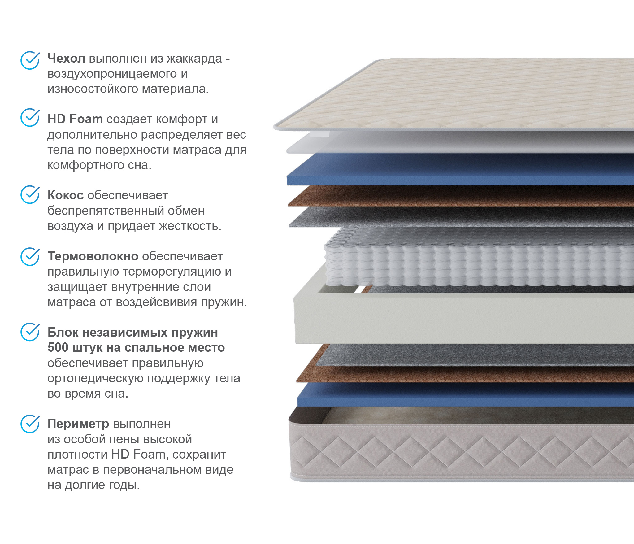 - термоволокна, отделяющего комфортные слои от независимого пружинного блока с целью предотвращения истирания.