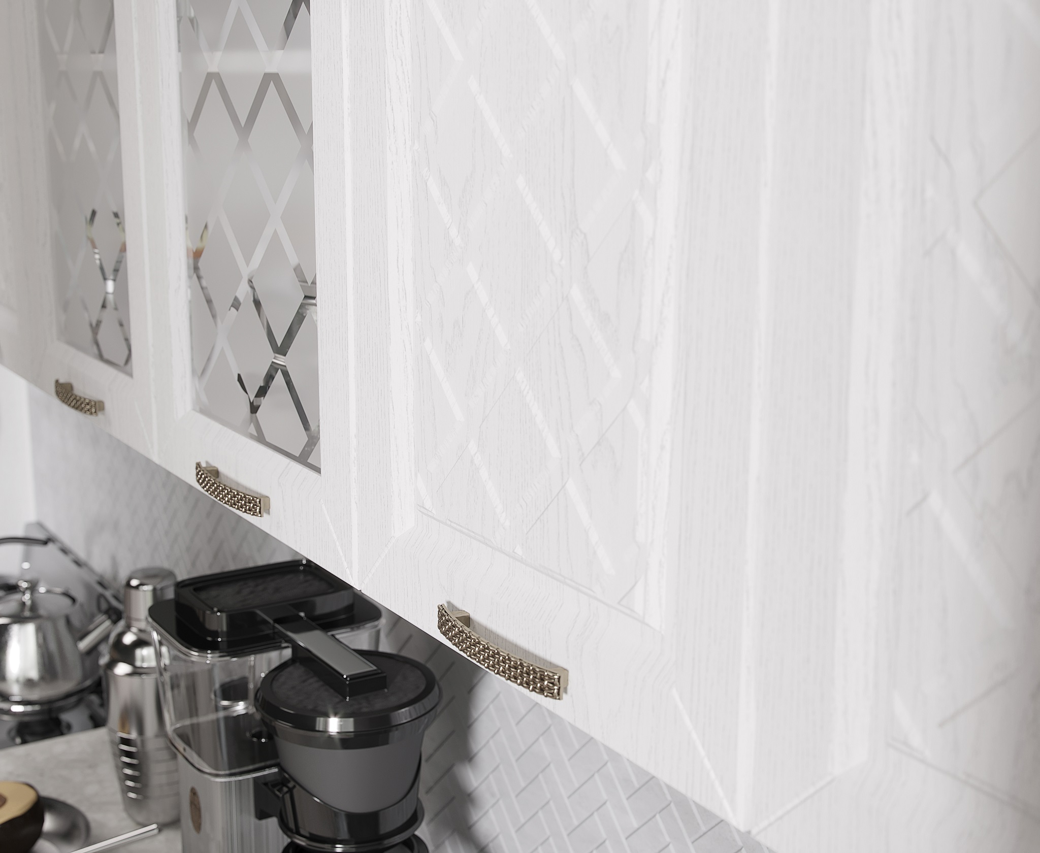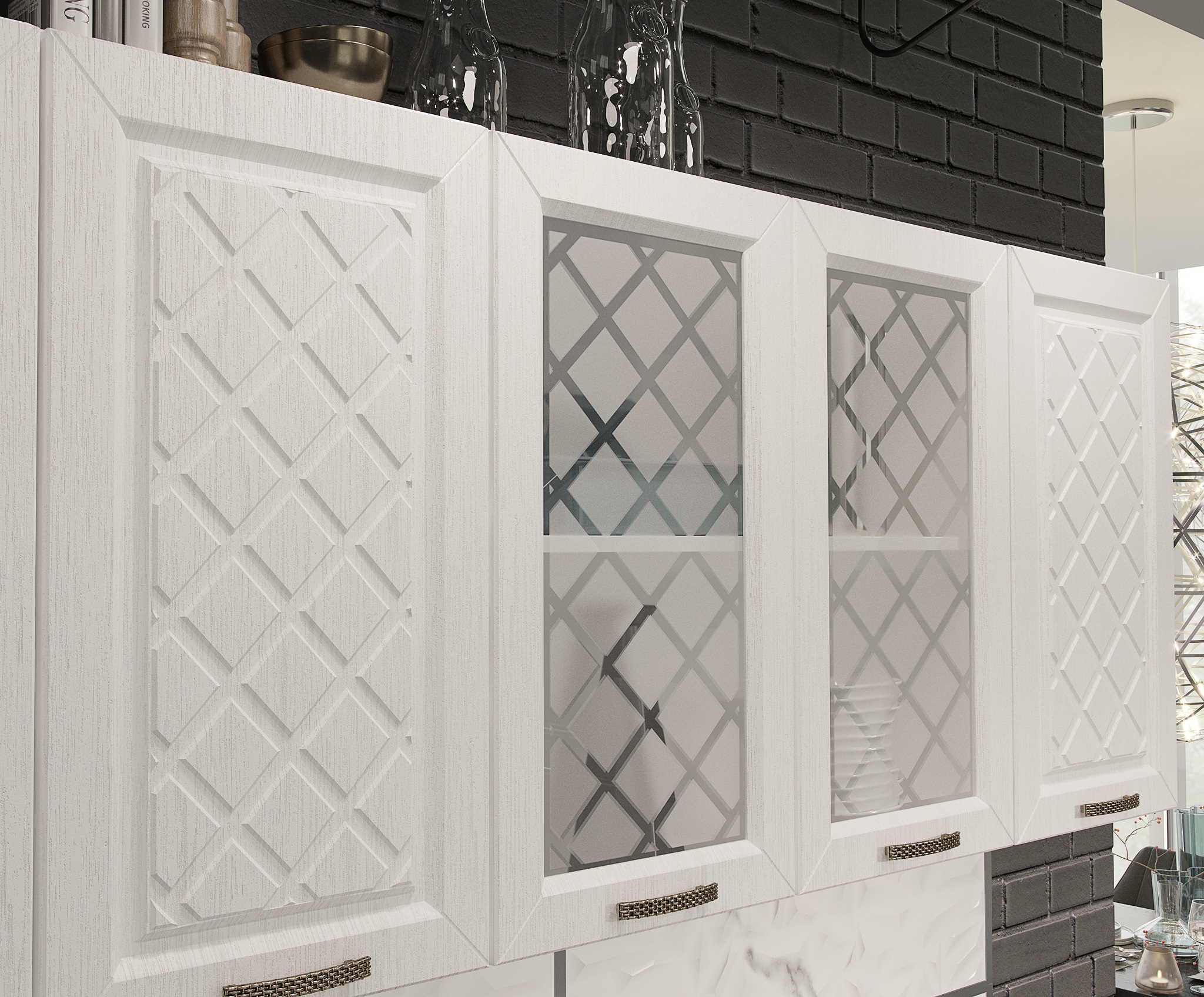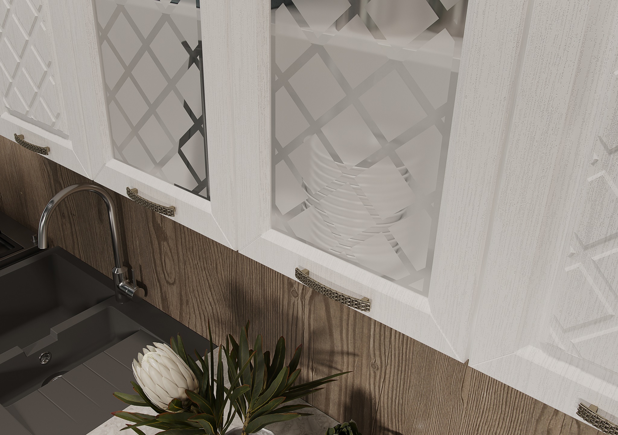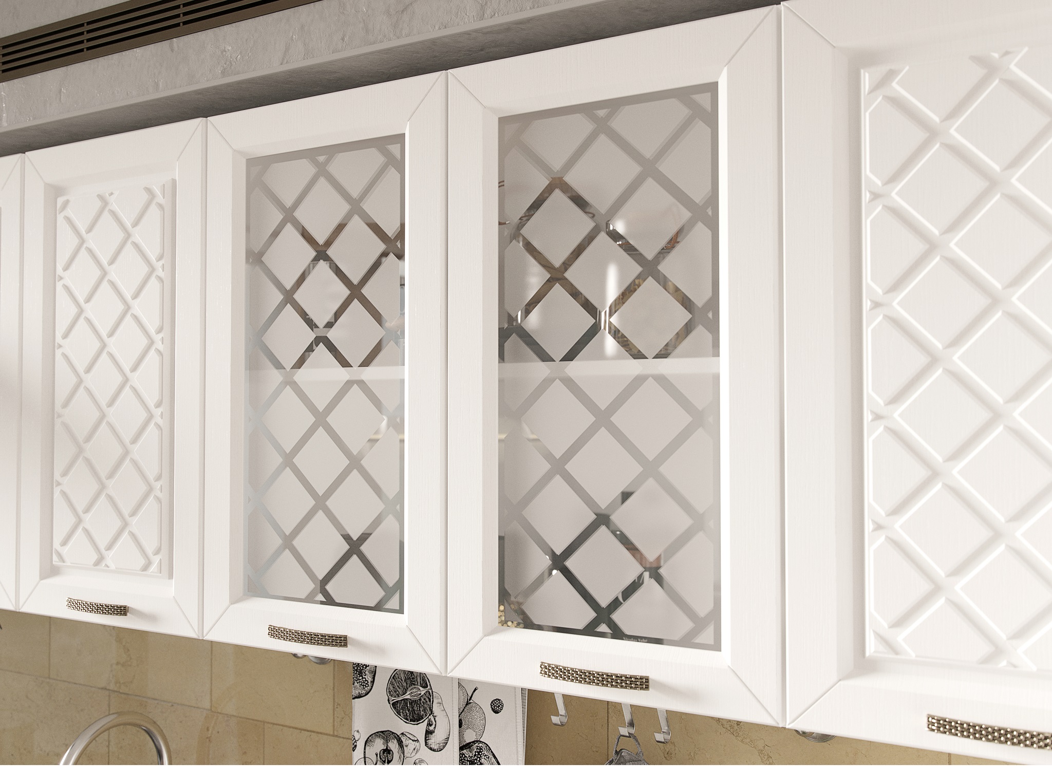 Кухня Агава- изящный гарнитур с фрезеровкой по фасаду и матовыми стёклами.