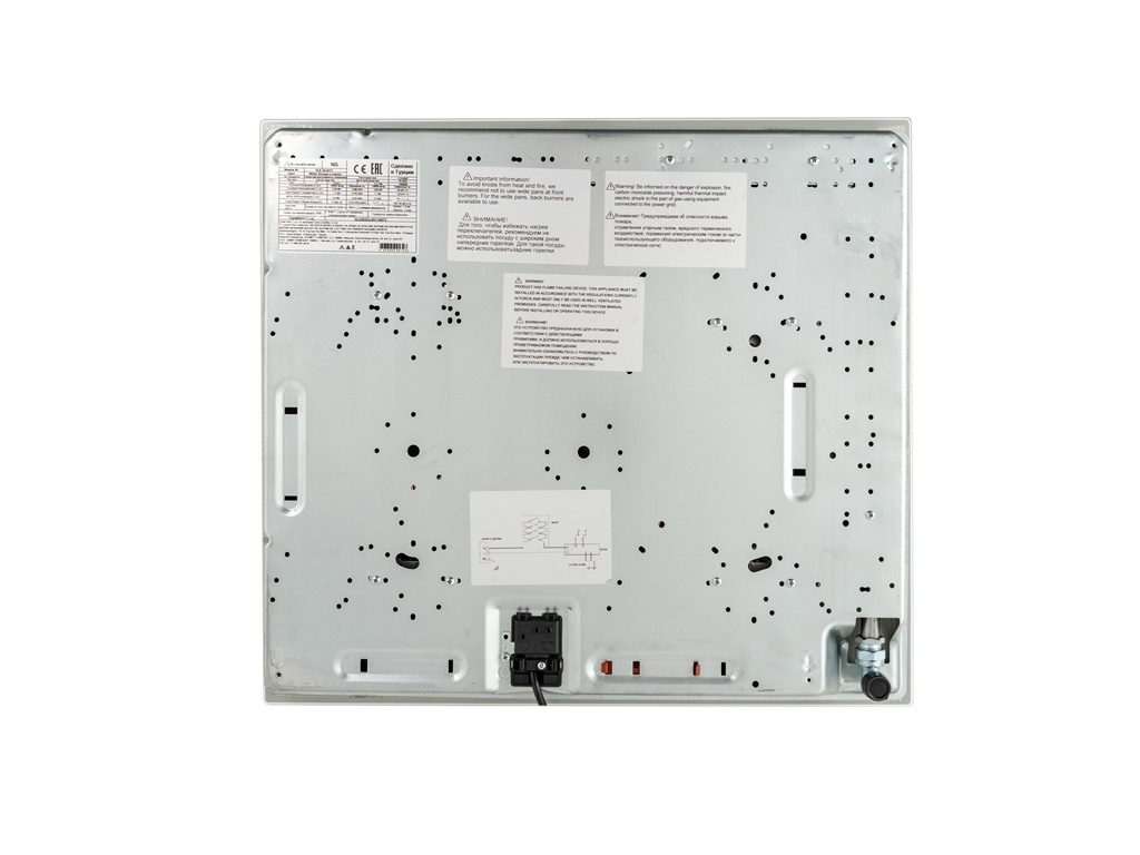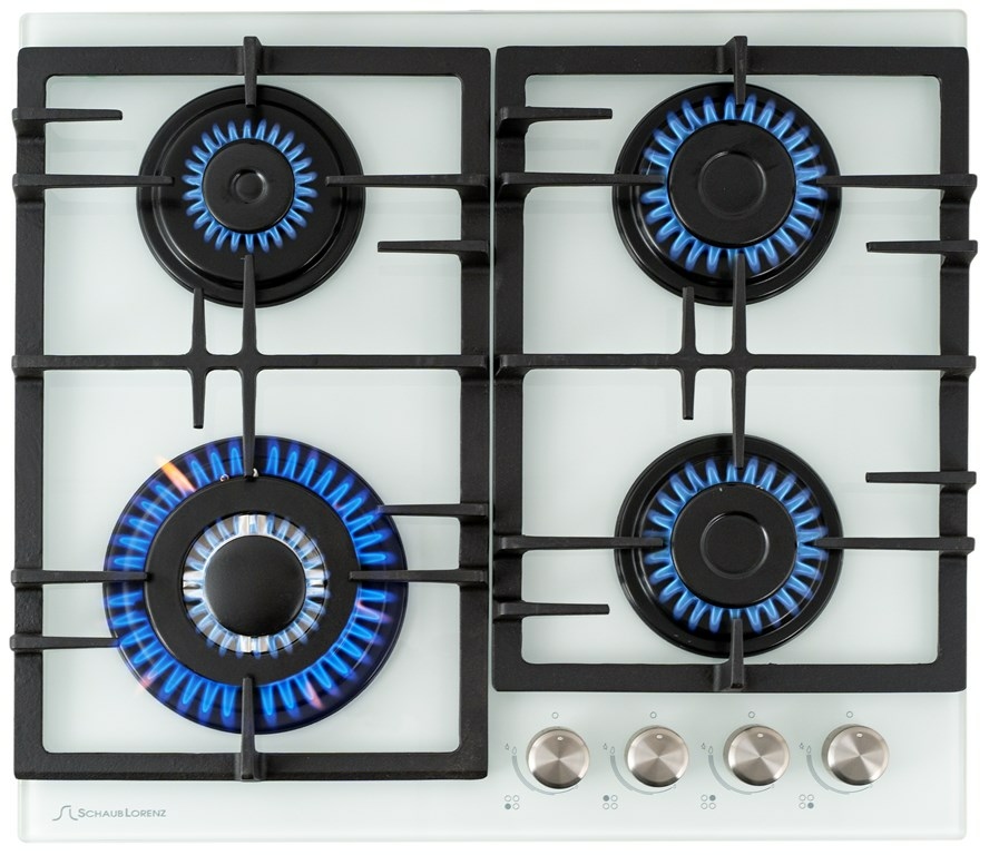 Газовая варочная поверхность закалённое стекло, Ширина 60 см, 4 газовые конфорки, 1 экономичная конфорка (0,9 кВт), 2 стандартные конфорки (1,7 кВт), 1 ВОК конфорка(3,5 кВт), Автоподжиг, Чугунные решетки, Жиклёры для баллонного газа, Газ-контроль, Цвет: белое стекло.