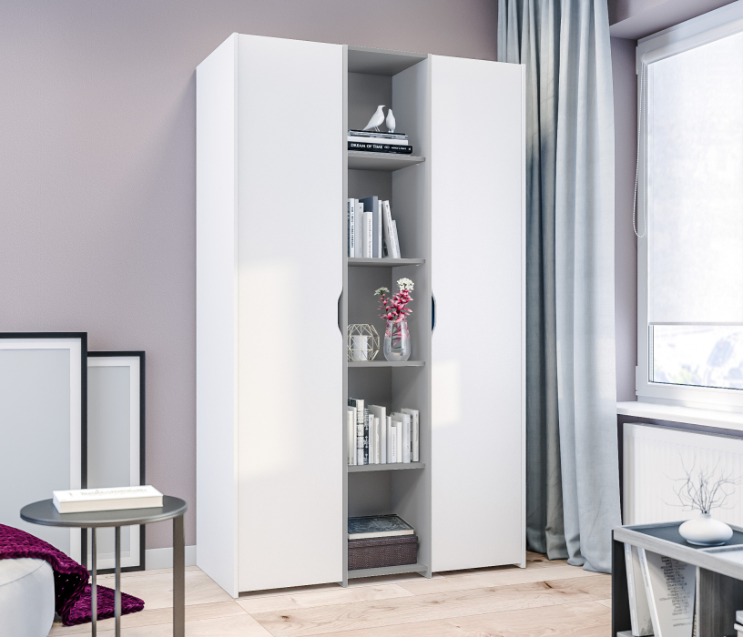 Габаритные размеры – ширина 119 см, высота 200,4 см и глубина 55,7 см. Шкаф имеет плательное отделение со штангой для плечиков, закрытое отделение с четырьмя глубокими полками и отделение с четырьмя открытыми полками. Корпус шкафа выполнен из прочного ламинированного ДСП, отделка в цвете «Белый альпийский». Материал фасадных поверхностей – ЛДСП в цветах отделки «Белый альпийский» и «Серый перламутровый».