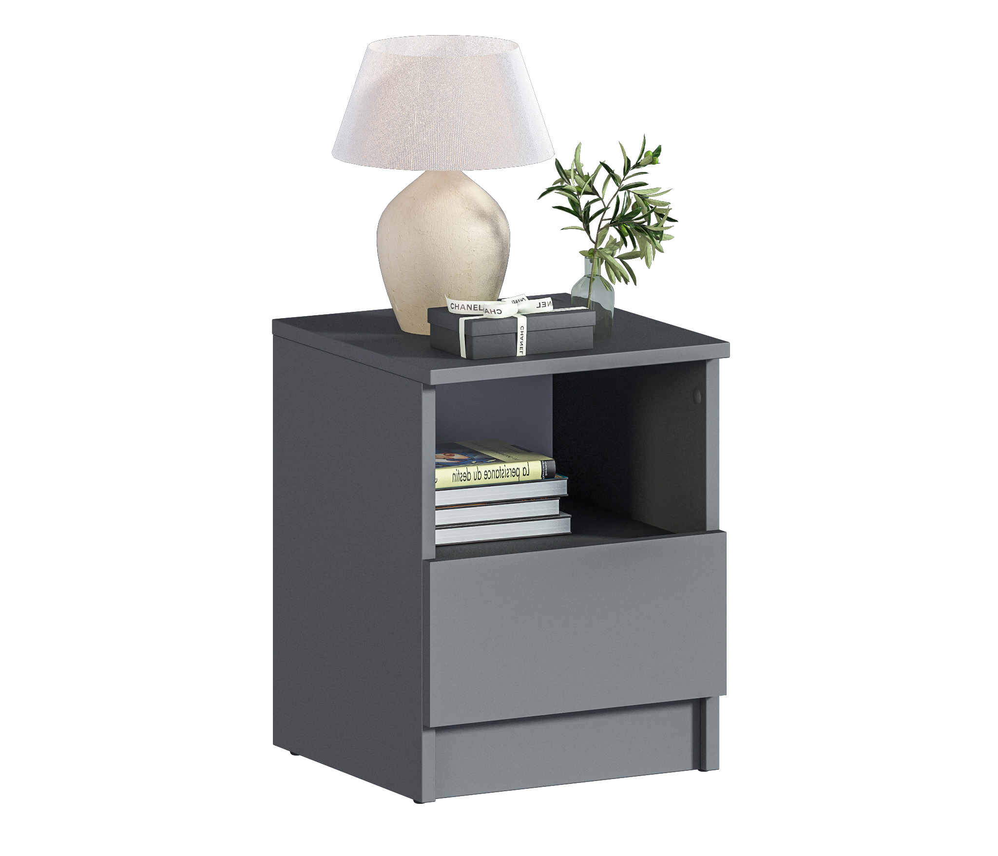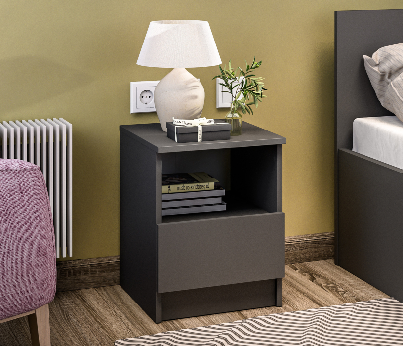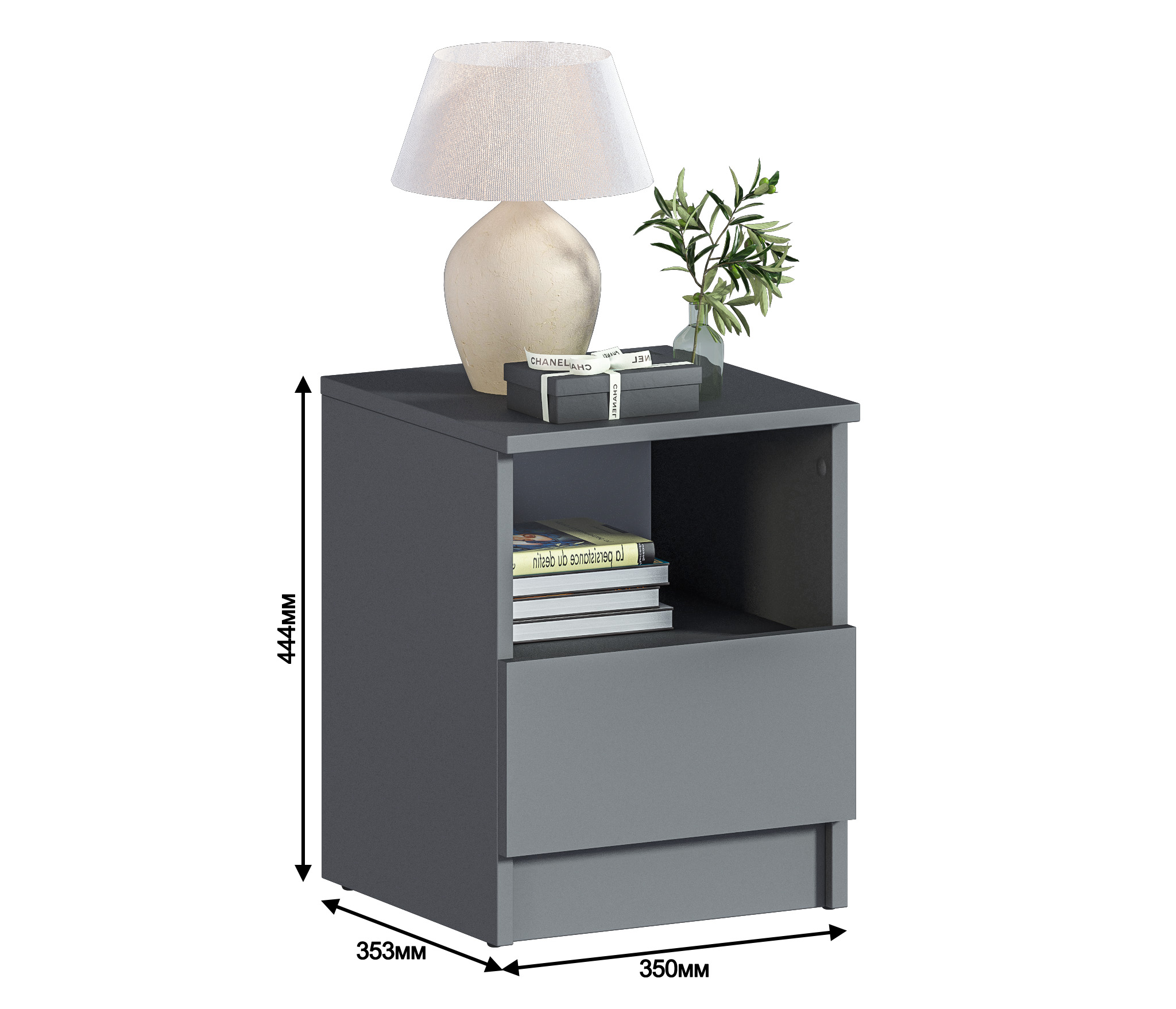 При компактных габаритных размерах – ширина 35 см, высота 44,4см и глубина 35,3 см, тумба довольно вместительная. Под столешницей расположены открытая полка и выдвижной ящик, куда можно положить планшет или книгу.