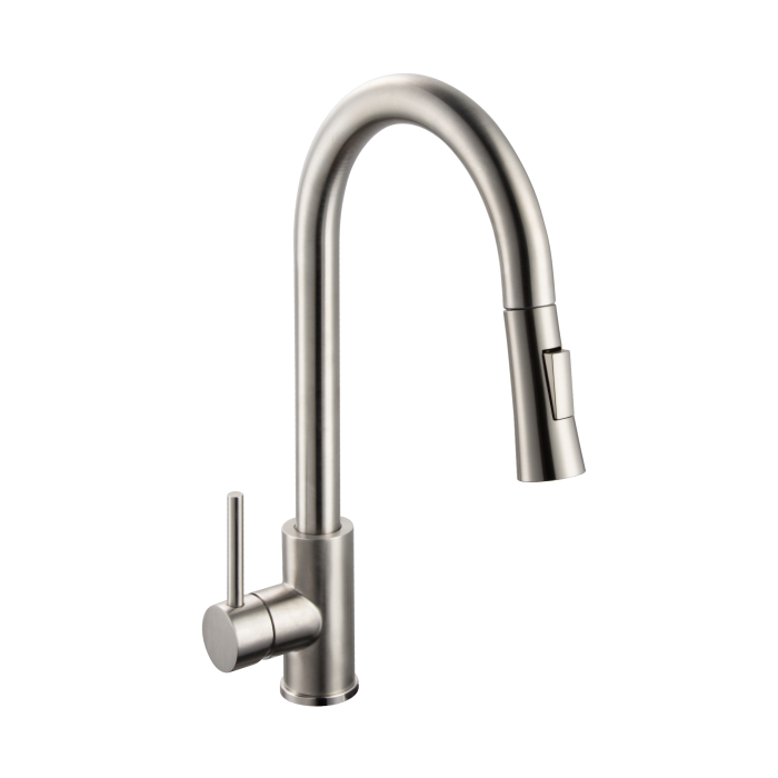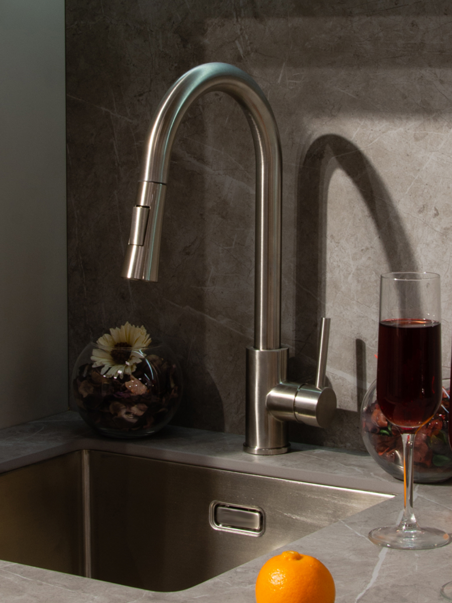Смеситель для кухни из нержавеющей стали с выдвижным изливом и 2-режимной лейкой.