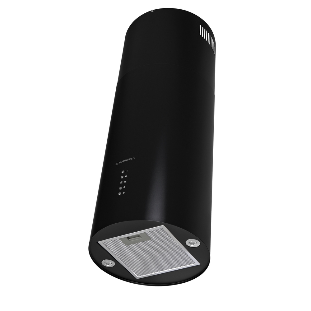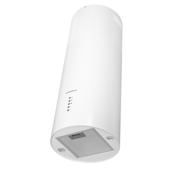 Корпус цилиндрической формы, выполненный из нержавеющей стали с термостойким покрытием белого цвета, крепится на потолок над поверхностью плиты. Алюминиевый многослойный жироулавливающий фильтр находится в нижней части вытяжки.
