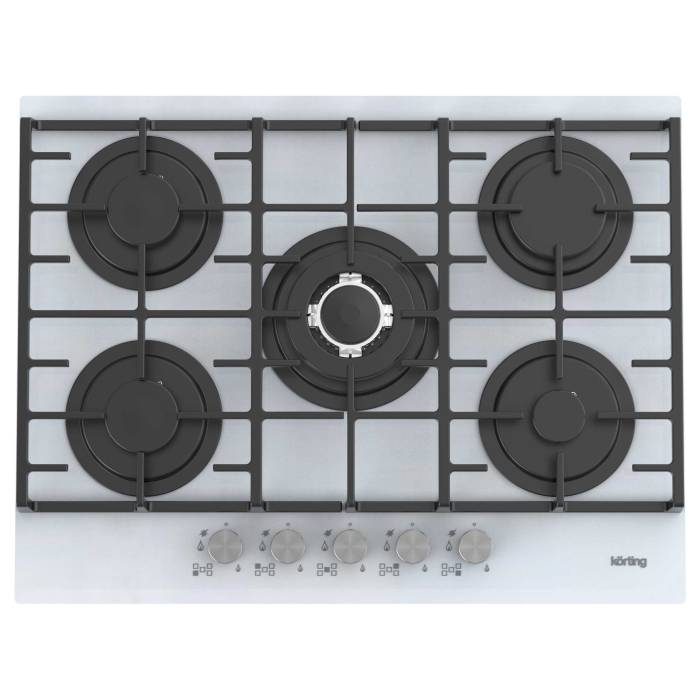 Газовая варочная панель из закаленного стекла, ширина 70 см, 5 высокоэффективных конфорок, сверхмощная конфорка WOK 3,8 кВт, автоматический электроподжиг, газ-контроль каждой конфорки, передние металлические переключатели, чугунные решетки для посуды, в комплекте - чугунная подставка WOK, адаптер для кофейника, скошенный передний край.