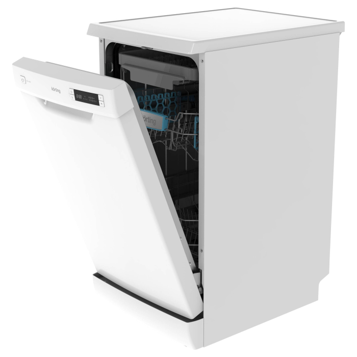 Отдельност., 45 см, А++/A/A, электронное управление, дисплей с LED индикацией выбранной программы, 8 программ, 10 компл., автоматическая программа, третья корзина для столовых приборов и мелкой посуды, функция интенсивной мойки для особо грязной посуды, таймер отложенного старта до 24 часов, половинная загрузка, защита от протечек, ур.шума 49 дБ, тестер для определения уровня жесткости воды в комплекте, цвет - белый.