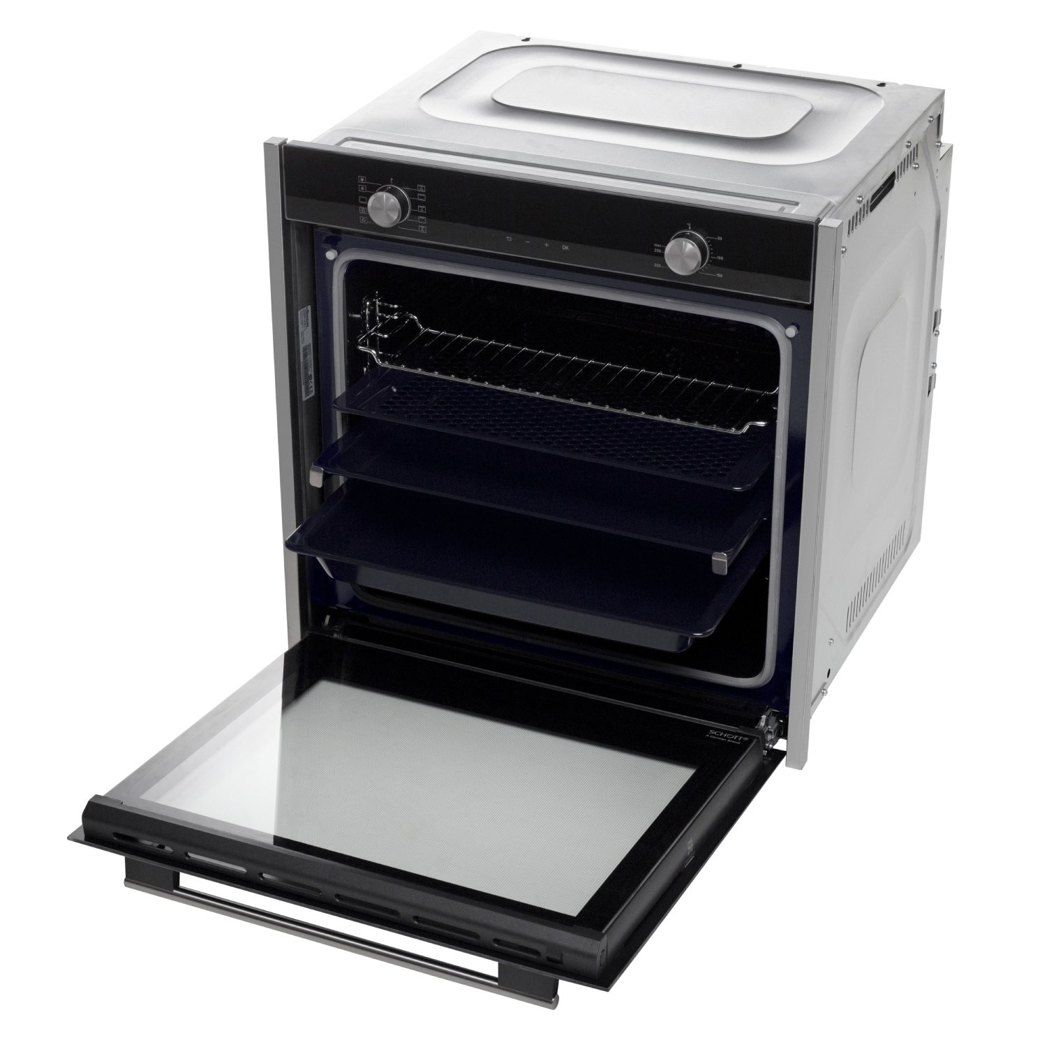 • Материал фасада: Узкая стеклянная панель управления + стеклянная дверца духовки из черного стекла от немецкого производителя Schott Ceran + интегрированные боковые полоски из нержавеющей стали