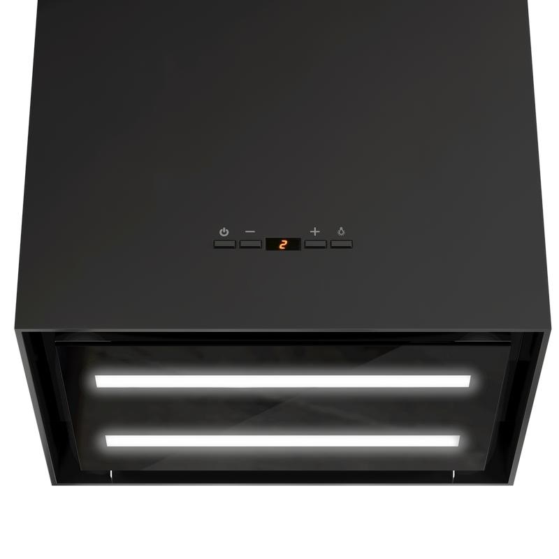 • Дизайнерская островная вытяжка в форме прямоугольного параллелепипеда становится центральным вертикальным элементом, связывающим дизайн кухни воедино. Стильное сочетание нержавеющей стали «сатин» и блеска закаленного стекла создают ощущение легкости прочной конструкции. Декоративный стеклянный люк скрывает алюминиевый, жироулавливающий фильтр, придавая завершенность композиции