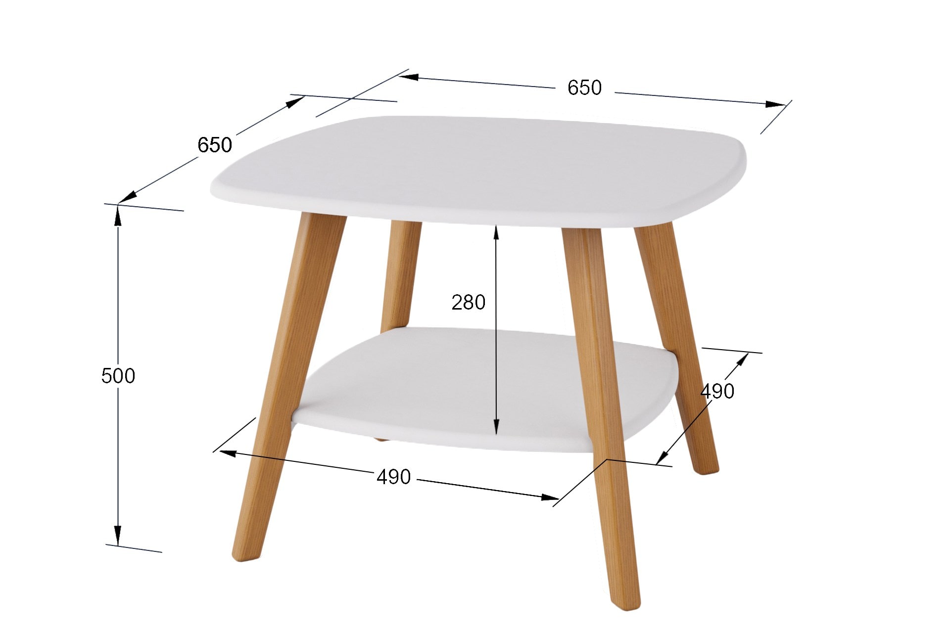 Размер 650х650х500мм. Благодаря квадратной форме столешницы, полки и компактным размерам, стол безупречно дополнит интерьер гостиной или офиса. Максимальная нагрузка до 30 кг